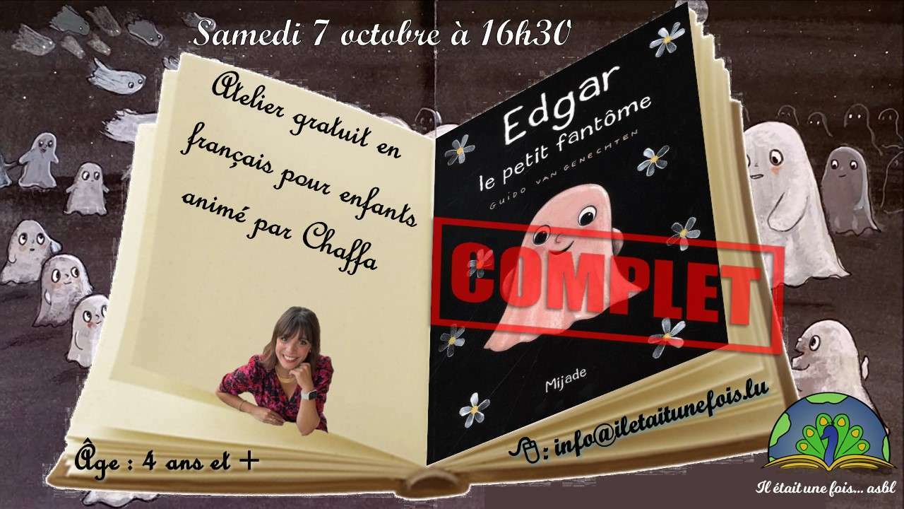 ![]() | Atelier de lecture interactive en français pour enfants (3+)07. Octobre 2023 | de 16h30 à 17h30 Code d'activité : AT071023FR ***COMPLET**Atelier de lecture interactive pour enfants Langue: français âge: 3 ans et plus Présence d'un adulte indispensable avec l'enfant Prix: gratuit Durée: une heure Livre: Edgar le petit fantôme Guido Van Genechten - - - - - - - - - - - - - - - - - - - - - - Edgar n’est pas un petit fantôme comme les autres. A l’école des fantômes, alors que tous les petits fantômes apprennent à pousser des hurlements terribles, Edgar se fait gronder car ses cris sont étranges : Wouh Wouh ouh ! Mais Edgar prouve qu’on peut être différent et très heureux. - - - - - - - - - - - - - - - - - - - - - - DIY : Wouh Wouh ouh ! - - - - - - - - - - - - - - - - - - - - - - Inscription : info@iletaitunefois.lu (merci d'indiquer le prénom et l'âge de l'enfant) |