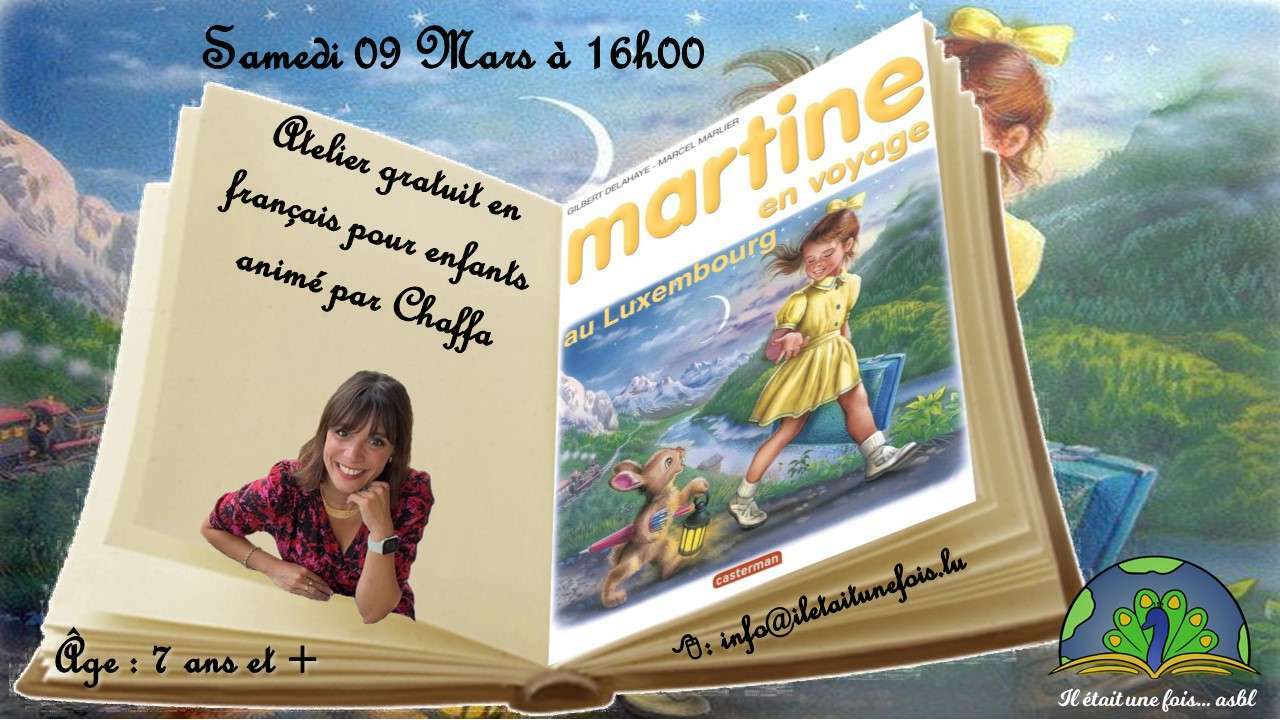 ![]() | Atelier de lecture interactive et d'écriture pour enfants (7+) animé par Chaffa et Hanna09. Mars 2024 | de 16h00 à 17h00 Code d'activité : AT090324FRMartine en voyage au Luxembourg Atelier de lecture interactive et d'écriture pour enfants Langue: français âge: 7 ans et plus Animatrices : Chaffa et Hanna Présence d'un adulte indispensable avec l'enfant Prix: gratuit Durée: une heure Martine en voyage au Luxembourg - - - - - - - - - - - - - - - - - - - - - - Au menu: - lecture - invention de l’histoire de Martine en voyage au Luxembourg. - lieux et musées à intégrer dans l’histoire - - - - - - - - - - - - - - - - - - - - - - Inscription : info@iletaitunefois.lu (merci d'indiquer le prénom et l'âge de l'enfant) 1) Enzi-Amani 7 2) Inès 8 3) Alice 8 4 5) 6) 7) 8) 8 PLACES DISPONIBLES UNIQUEMENT |