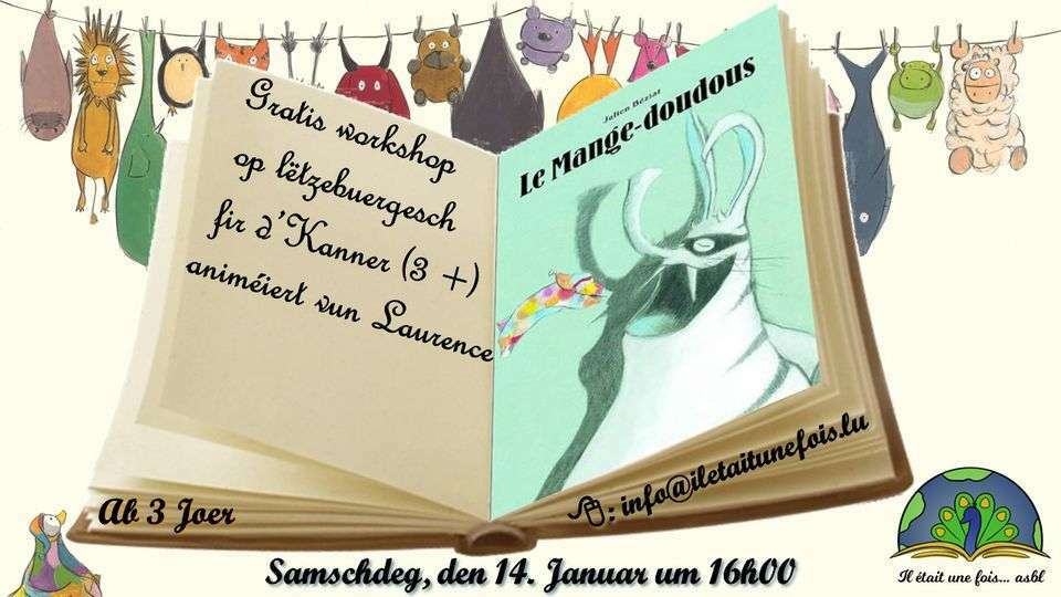 ![]() | Liesung fir d'Kanner (3+) op Lëtzebuergesch animéiert vun Laurence14. January 2023 | de 16h00 à 17h00 Code d'activité : AT140123LULiesung fir d'Kanner op Lëtzebuergesch animéiert vun Laurence Präis: Gratis Animateurin: Laurence Sprooch: Lëtzebuergesch Alter: Vun 3 Joer Beschreiwung: Zesumme (d'Kanner an hir Elteren) lauschtere mir esou eng Geschicht an duerno bastele mir eppes Umeldung: info@iletaitunefois.lu / Tel. 621.356.429 Gitt wgl. bei der Umeldung den Alter vum Kand un. |