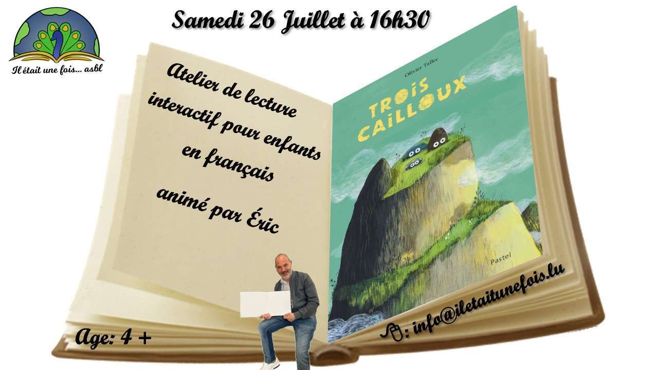 ![]() | Atelier de lecture interactive pour enfants (6+)26. Juillet 2025 | de 16h30 à 17h30. Code activité AT260725FRAtelier de lecture interactive pour enfants (3+) Prix : gratuit Langue: français Animateur: Éric Lieu: Il était une fois... asbl 6, rue Tony Bourg L-1278 Gasperich âge: 3 ans et plus Livre : Trois cailloux - - - - - - - - Inscription par mail info@iletaitunefois (veuillez indiquer 'âge et le prénom de l'enfant et le code AT260725FR (places limitées) Merci et à bientôt 1 2 3 4 5 6 7 8 9 10 11 12 |