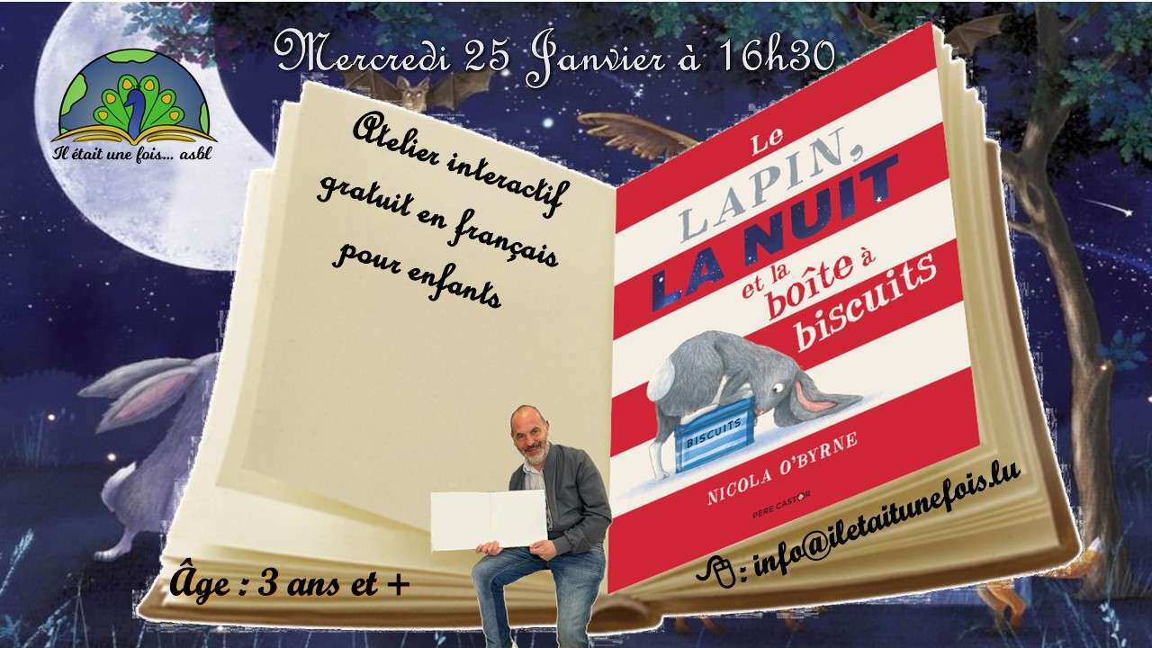 ![]() | Atelier de lecture interactive en français pour enfants (3+) animé par Éric25. January 2023 | de 16h30 à 17h30 Code d'activité : AT250123FRAtelier interactif pour enfants Prix : Gratuit ÂGE: 3 ans et plus Langues : Français Livre : "Le lapin, la nuit et la boîte à biscuits" de Rose-Marie Vassallo Éditions : Père Castor Bricolage : DIY Heure: de 16h30 à 17h30. Inscription obligatoire (merci d'indiquer le prénom et l'âge de l'enfant). Présence d'un adulte obligatoire avec l'enfant - - - - - - - - - - - - - - - - - - - - - - - - - - Il commence à faire noir. La Nuit n'est pas loin... Pourtant Lapin n'a pas du tout envie d'aller au lit ! Alors, il décide d'enfermer la Nuit dans une boîte. Rien ne l'obligera à aller se coucher ! Mais Lapin va découvrir que la Nuit est très, très utile... - - - - - - - - - - - - - - -- - - - - - - - - - - - - |