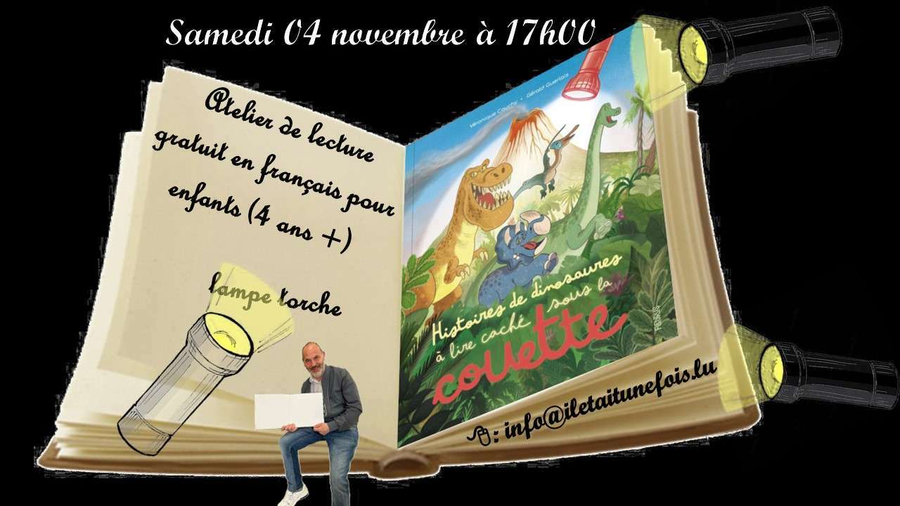 ![]() | Atelier de lecture semi-nocturne pour enfants (4+)04. November 2023 | de 17h00 à 18h00 Code d'activité : AT041123FRHalloween est fini ? Et si on se faisait une petite frayeur de plus, histoire de bien s'amuser ? Lecture en semi-nocturne Langue: français âge: 4 ans et plus Présence d'un adulte indispensable avec l'enfant Prix: gratuit Durée: une heure Livre: "Histoires de dinosaures à lire sous la couette" - - - - - - - - - - - - - - - - - - - - - - Un livre avec de l'encre invisible, des histoires à explorer muni d'une lampe magique pour découvrir tous les secrets cachés... au temps des dinosaures ! Chippy affamé s'attaque aux oeufs de maman T-rex, et ce n'est pas une très bonne idée...Stéguy le stégosaure a perdu sa maman, où est-elle passée ?Tiki, Raa et Roo jouent au bord de l'eau quand quelque chose attrape la patte de l'un d'eux. Mais qui est le monstre qui se cache sous l'eau ? - - - - - - - - - - - - - - - - - - - - - - Inscription : info@iletaitunefois.lu (merci d'indiquer le prénom et l'âge de l'enfant) |
