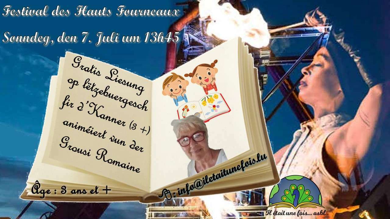 ![]() | Gratis Liesung fir d'Kanner (3+) animéiert vun der Grousi Romaine07. Juillet 2024 | de 13h45 à 14h15Gratis Liesung fir d'Kanner (3 Joer+) op Lëtzebuergesch animéiert vun der Grousi Romaine Präis: Gratis Animateurin: Romaine Sprooch: Lëtzebuergesch Dauer: 30 Minuten Ort: Festival des Hauts Fourneaux Esch-Belval Avenue du Rock'n'roll Fir d'Kanner ab 3 Joer. - - - - - - - - - - - - - - - - - - - - - - - - - - - - - - - - - - - - - - - - - Umeldung: info@iletaitunefois.lu / Tel. 621.356.429 Gitt wgl. bei der Umeldung den Alter vum Kand un. 1) 2) 3) 4) 5) 6) 7) 9) 10) |