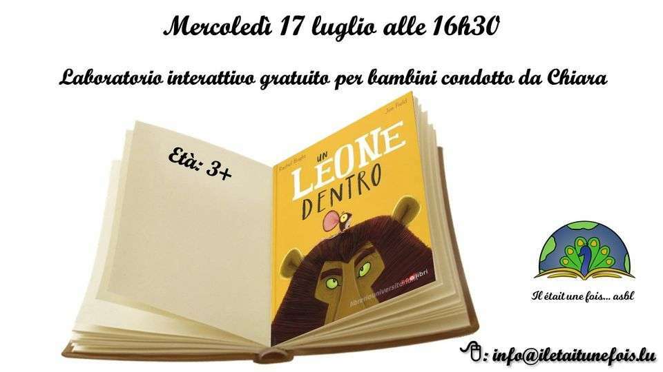 ![]() | Laboratorio interrativo gratuito per bambini (3+) animato da Chiara17. Juillet 2024 | de 16h30 à 17h30 Code d'activité AT170724ITLaboratorio interrativo gratuito per bambini (3+) animato da Chiara Lingua: italiano Età di lettura: da 3 anni. Località: Il était une fois... asbl (Gasperich) Prezzo: gratuito Durata: un'ora Registrazione : info@iletaitunefois.lu (indicare il nome e l'età del bambino e il codice AT170724IT Libro: "Un leone dentro" Rachel Bright - - - - - - - - - - - - - - - - - - - - - - 1) Daniela C 3ans 2 3 4 5 6 7 8 |