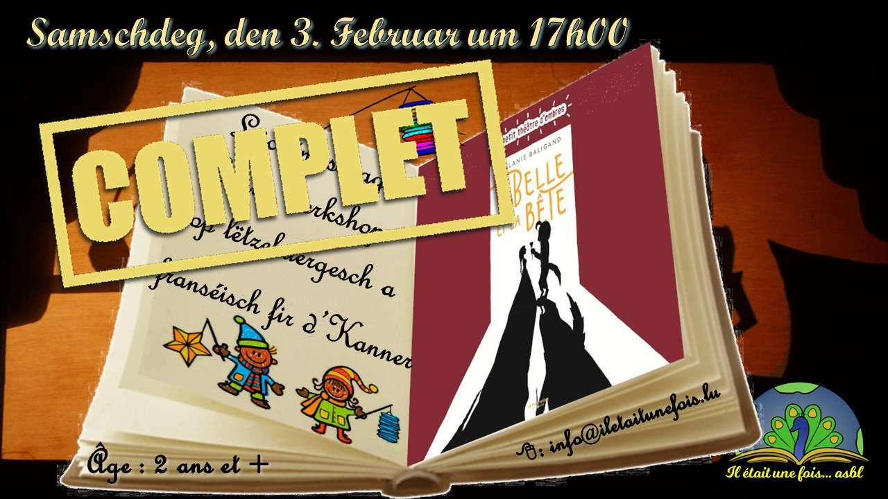 ![]() | COMPLET ! Atelier de lecture Liichtmëssdag en semi-obscurité pour enfants (Luxembourgeois-français)03. February 2024 | de 17h00 à 17h45 Code activité AT030224LUFR **COMPLET**Il était une fois... Liichtmëssdag Sproochen: Lëtzebuergesch a franséisch Théâtre d'ombres / fête des lampions Les enfants peuvent venir avec leur jolis lampions Lecture en semi-obscurité Präis: Gratis Heure: de 17h00 à 17h45 Buch: Dat Schéint an de Béischt (La belle et la bête) Eng Geschicht fir Kanner vun 2 bis 9 Joer. Liichtmëssdag lidd : Léiwer Härgottsblieschen Umeldung: info@iletaitunefois.lu / Tel. 621.356.429 Gitt wgl. bei der Umeldung den Alter vum Kand un. Inscription (obligatoire): info@iletaitunefois.lu (merci de préciser le prénom de l'enfant) Remarque: un adulte doit accompagner l'enfant durant toute la durée de l'atelier - - - - - - - - - - - - - - - - - - - - - - - - - - Livre: La belle et la bête Un livre pop-up spectaculaire à savourer quand il fait nuit Venez découvrir le grand classique de la littérature jeunesse comme vous ne l'avez jamais vu. Une seule chose à faire : éteindre la lumière et laisser la magie des jeux d'ombre opérer. - - - - - - - - - - - - - - - - - - - - - - 1) Rita 3 2) Léana 4 3-4) Danin 5 et Daris 8 5-6) Karim 9 et Yacoub 4 7) Calixte 2 8-9) Chloé (4 ans) et Lilly (2 ans) 10-11) Iriela, 6 ans et Aro 4 ans 12) Jonathan (5 ans) 13) Alessandro 14-17) Natalia 7, Livio 7, Dimitris 4, Adele 3 18) Davide 5 19) Ezequiel 4 20-21) Edi (4 ans) et Daniela (6 ans) 22) David 23-24) Leonardo 5 et Andrea 3 25-26) Liam et Luísa 4 27) Darío 2 28-29) Emma (6) et Edoardo (4) 30) Alessandro 31) David 2,5 32) Léon 2 33-34) Nell 4 & Tim 2 35) Christopher 36-37) Lisa (5) et Marie (9) 38-39) Sofia 3 et Alexandre 4 40-41) Ivo 4 et Isac 2 42) Christian 9 43) Mattia 6mois 44) Julia 5 COMPLET |