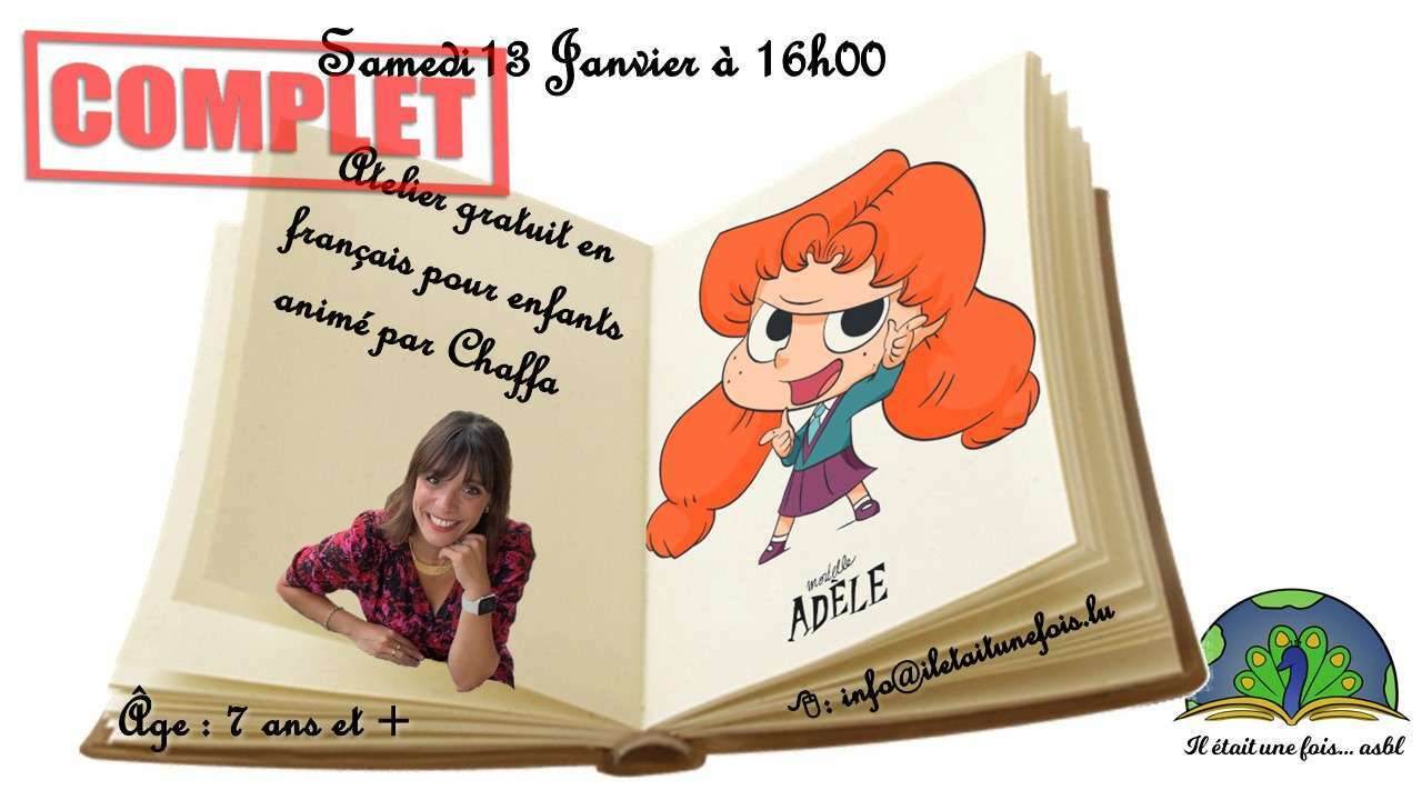 ![]() | ***ANNULé*** Atelier de lecture interactive pour enfants (7+)13. January 2024 | de 16h30 à 17h30 Code activité AT130124FR ***ANNULé***Mortelle Adèle Atelier de lecture pop-up interactive pour enfants Langue: français âge: 7 ans et plus Animatrices : Chaffa et Hanna Présence d'un adulte indispensable avec l'enfant Prix: gratuit Durée: une heure Mortelle Adèle - - - - - - - - - - - - - - - - - - - - - - Au menu: - lecture - coloriage - création d’une planche de BD - - - - - - - - - - - - - - - - - - - - - - Inscription : info@iletaitunefois.lu (merci d'indiquer le prénom et l'âge de l'enfant) 1-2) Peter 10 et Anna Lisa 7 3) Noelia 8 4-5) Eva 10 et Victor 7 6) Romane 7 7) Lina 8 8) Diana 8 ***COMPLET*** |