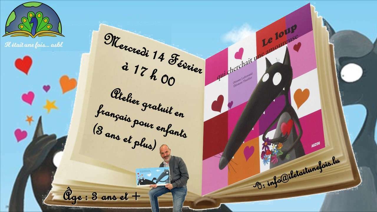 ![]() | Atelier de lecture interactive pour enfants (3+) animé par Éric14. February 2024 | de 17h00 à 18h00 Code Activité AT140224FRAtelier de lecture interactive gratuite pour enfants (3+) animé par Éric Langue: français âge: 3 ans et plus Présence d'un adulte indispensable avec l'enfant Prix: gratuit Durée: une heure Livre: "Le loup qui cherchait une amoureuse" d'Orianne Lallemand Auzou Éditions - - - - - - - - - - - - - - - - - - - - - - Il était une fois un gros loup noir, plutôt mignon, plutôt gentil, mais qui n'avait pas d'amoureuse. Un jour, il décida d'en trouver une. Mais comment savoir si c'était bien la louve de sa vie ? Facile ! Quand il la verra, il aura les jambes flagada, la cervelle en chocolat et le cœur qui bat ! Thème : l'amour - - - - - - - - - - - - - - - - - - - - - - Inscription : info@iletaitunefois.lu (merci d'indiquer le prénom et l'âge de l'enfant) 1) Theo 3 2/3) Ethan et Luca 5/3 4) lyandra 6 |