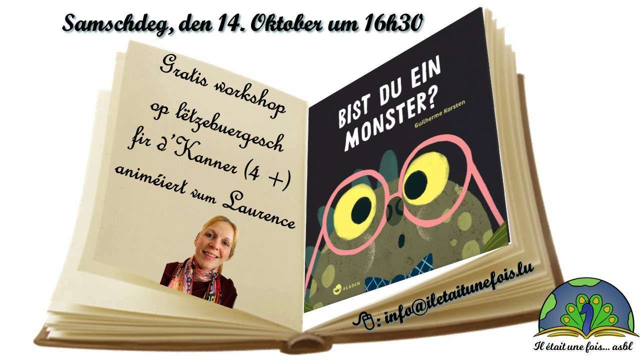 ![]() | Gratis Liesung fir d'Kanner (4 Joer+) op Lëtzebuergesch animéiert vum Laurence14. October 2023 | de 16h30 à 17h30 Code d'activité : AT141023LUGratis Liesung fir d'Kanner (4 Joer+) op Lëtzebuergesch animéiert vum Laurence Präis: Gratis Animateurin: Laurence Sprooch: Lëtzebuergesch “Bist du ein Monster ?” - Guilherme Karsten Eng Geschicht fir brav an net esou brav Kanner vun 4 bis 9 Joer. - - - - - - - - Warnung! In diesem Buch wohnt ein Monster! Ein wirklich großes, unheimliches, böses Monster ... (das behauptet jedenfalls das Monster). Und es hat eine wichtige Frage: Bist du auch ein Monster?In diesem lustigen, interaktiven Bilderbuch zum Vorlesen fordert das Monster die Kinder dazu auf, nachzuschauen, wie viel Monster in ihnen steckt. Haben sie auch große gelbe Augen und große Zähne? Und können sie genauso laut brüllen können und stampfen wie ein gefährliches Monster?Ein großer Spaß für die ganze Familie, wenn Kinder und Vorlesende sich gegenseitig beim Monsterspielen überbieten. Am Ende bekommt sogar das Monster ein bisschen Angst und bereut, dass es die Frage überhaupt gestellt hat ...Ein besonderer interaktiver Vorlesespaß für Kinder ab 4 Jahren. - - - - - - - - - - - - - - - - - - - - - - - - - Umeldung: info@iletaitunefois.lu / Tel. 621.356.429 Gitt wgl. bei der Umeldung den Alter vum Kand un. |