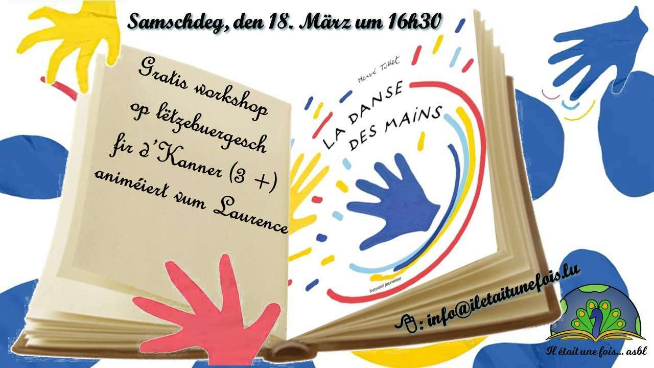 ![]() | Gratis Liesung fir d'Kanner (3+) op Lëtzebuergesch animéiert vum Laurence18. March 2023 | de 16h30 à 17h30 Code d'activité : AT180323LUGratis Liesung fir d'Kanner (3 Joer+) op Lëtzebuergesch animéiert vum Laurence Präis: Gratis Animateurin: Laurence Sprooch: Lëtzebuergesch Beschreiwung: Zesumme (d'Kanner an hir Elteren) lauschtere mir esou eng Geschicht an duerno bastele mir eng schéine Klengegkeet (Eenhar) Umeldung: info@iletaitunefois.lu / Tel. 621.356.429 Gitt wgl. bei der Umeldung den Alter vum Kand un. - - - - - - - - - - - - - - - - - - - - - - - - - La danse des Mains - - - - - - - - - - - - - - - - - - - - - - - - - |