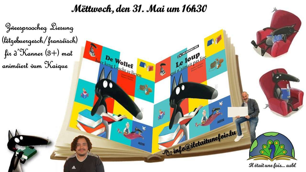 ![]() | Zweeproocheg Liesung (lëtzebuergesch a franséisch) fir d'Kanner (3+)31. Mai 2023 | de 16h30 à 17h30 Code d'activité : AT310523LUFRZweeproocheg Liesung (lëtzebuergesch a franséisch) fir d'Kanner Heure: de 16h30 à 17h30. Lecture bilingue luxembourgeoise et française Âge : Enfants (accompagnés) à partir de 3 ans Animatrices : Kaique / Éric Prix : gratuit Langues : Français et Luxembourgeois Durée: Une heure Inscription (obligatoire): info@iletaitunefois.lu (merci de préciser le prénom de l'enfant) Remarque: un adulte doit accompagner l'enfant durant toute la durée de l'atelier - - - - - - - - - - - - - - - - - - - - - - - - - - Livre : Le loup qui n'aimait pas lire / De Wollef huet keng Loscht ze liesen - Julia Donaldson - - - - - - - - - - - - - - - - - - - - - - - - - - Loup déteste lire. Lui, ce qu’il aime, c’est le goût du papier, pas les histoires racontées dans les livres. Et aussi vivre des aventures pour de vrai! Et si son incroyable voyage au Pays des livres le faisait changer d’avis? Thèmes : Lecture, chiffres, aventure, contes, référents culturels - - - - - - - - - - - - - - - - - - - - - - - - - Bricolage : - - - - - - - - - - - - - - - - - - - - - - - - - |