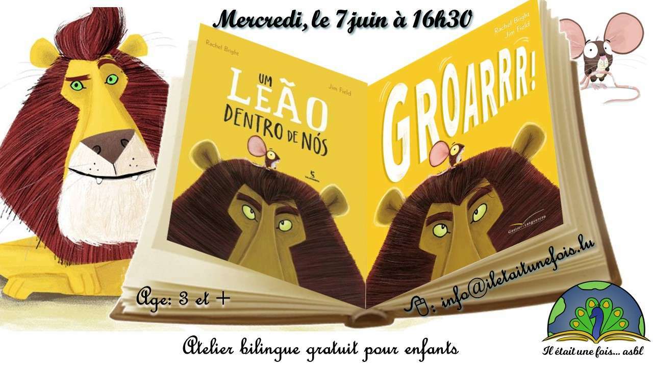 ![]() | Atelier de lecture bilingue français / portugais pour enfants (3+)07. Juin 2023 | De 16h30 à 17h30 Code d'activité : AT070623FRPTAtelier interactif de lecture bilingue français/portugais pour enfants (3+) Prix: gratuit Lieu: Il était une fois asbl. 6, rue Tony Bourg. L-1278 Gasperich Age: 3 ans et plus Langues : Français et Portugais Animateurs: Kaique et Eric Durée: une heure Inscription: info@iletaitunefois.lu Merci d'indiquer le code d'activité AT070623FRPT, l'âge et le prénom de votre enfant. Remarque: un adulte doit accompagner l'enfant durant toute la durée de l'atelier - - - - - - - - - - - - - - - - - - - - - - - - - - Livre : GROARRR! / O LEAO QUE TEMOS CA DENTRO (Bright, Rachel) - - - - - - - - - - - - - - - - - - - - - - - - - - Ce n'est pas toujours facile d'avoir des amis lorsqu'on est riquiqui ! Comment faire si l'on est une petite Souris ? Du haut de son rocher, le Lion ne se pose pas ce genre de question. Et si pour grandir, il suffisait d'apprendre à rugir ? Não tens de ser grande nem valente para encontrares a tua voz. Nem sempre é fácil ser pequeno. Mas quando o Rato parte em viagem à procura do seu rugido, descobre que até a mais pequenina criatura pode ter um coração de leão. - - - - - - - - - - - - - - - - - - - - - - - - - |