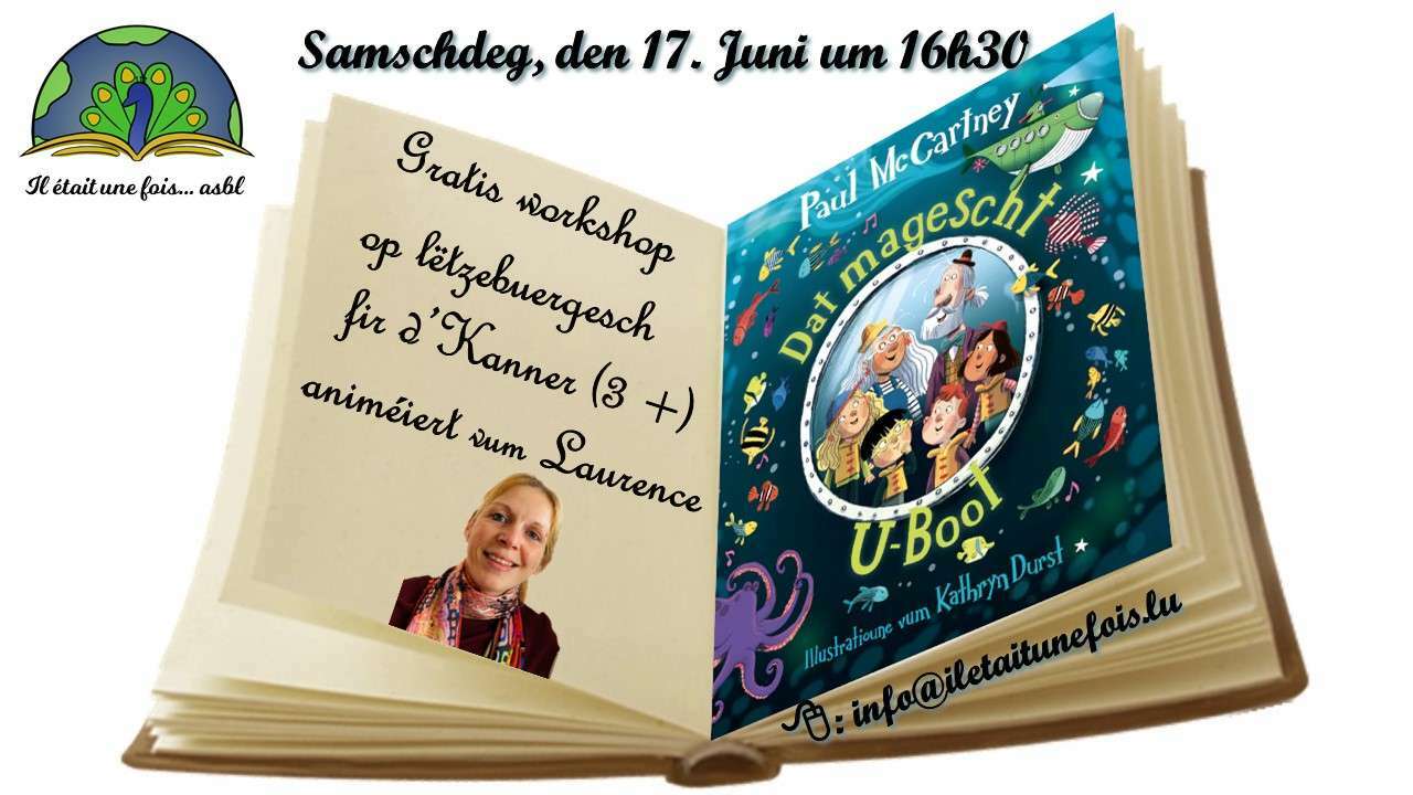 ![]() | Gratis Liesung fir d'Kanner (3 Joer+) op Lëtzebuergesch animéiert vum Laurence17. Juin 2023 | de 16h30 à 17h30 Code d'activité AT17062023LUGratis Liesung fir d'Kanner (3 Joer+) op Lëtzebuergesch animéiert vum Laurence Präis: Gratis Animateurin: Laurence Sprooch: Lëtzebuergesch “Dat magescht U-boot” - Paul McCartney Iwwersetzung: Luc Marteling Perspektiv Editions Ech fäerten, mir dreiwe an d’Mier… … - - - - - - - - - - - - - - - - - - - - - - - - - Umeldung: info@iletaitunefois.lu / Tel. 621.356.429 Gitt wgl. bei der Umeldung den Alter vum Kand un. |