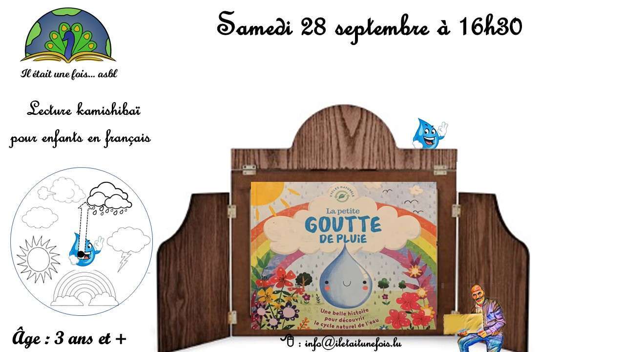 ![]() | Atelier Kamishibaï en français pour enfants (3+)28. Septembre 2024 | de 16h30 à 17h30 Code d'activité AT280924FRKamishibaï - lecture interactive pour enfants Langue: français âge: 3 ans et plus Animation : Éric Lieu: Il était une fois... asbl 6, rue Tony Bourg. L-1278 Gasperich Présence d'un adulte indispensable avec l'enfant Prix: gratuit Durée: une heure Livre: La petite goutte de pluie - Joyce Mélanie Editions: 123soleil - - - - - - - - - - - - - - - - - - - - - - La petite goutte de pluie vit paisiblement dans un nuage lorsqu'un jour, un orage éclate. #temps #pluie - - - - - - - - - - - - - - - - - - - - - - Bricolage: Roue - - - - - - - - - - - - - - - - - - - - - - - Inscription : info@iletaitunefois.lu (merci d'indiquer le prénom et l'âge de l'enfant ainsi que le code d'activité AT280924FR) 1 Kalina (4) 2-3 Ethan (6) et Luca (4) 4-5 Edi et Daniela 6 7 8 9 10 11 12 |