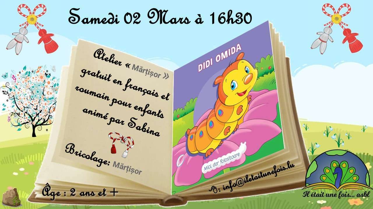 ![]() | Atelier « Mărțișor » en français et roumain pour enfants (2+) animé par Sabina02. Mars 2024 | de 16h00 à 17h00 Code activité AT020324ROFRAtelier « Mărțișor » gratuit en français et roumain pour enfants (2+) animé par Sabina Langue: roumain et français âge: 3 ans et plus Présence d'un adulte indispensable avec l'enfant Prix: gratuit Durée: une heure Livre: "Didi la chenille" - didi Omida Mici, dar folositoare. Veronica Podesta - - - - - - - - - - - - - - - - - - - - - - Les Roumains célèbrent le 1er Mars l’arrivée du Printemps, par la fête de « Mărţişor » (prononcer martzichor, nom populaire du mois de Mars), dont l’origine remonte au temps des Daces et des Romains. Le 1er Mars (martius en langue latine), premier jour du vieux calendrier romain on célébrait « Matroualia », la fête dédiée au dieu Mars, la divinité des forces de la nature, du printemps et de l'agriculture. - - - - - - - - - - - - - - - - - - - - - - Bricolage: Mărțișor Inscription : info@iletaitunefois.lu (merci d'indiquer le prénom et l'âge de l'enfant) 1-2) Ariadni 3 et Danae 5 3) Laurie 3,5 4-5) Luca 4 & Vladimir 3 6) Amira 4 7) Christian 4 8-9-10) Pietro 7, Gabriel 5 et Alessandro 3 11-12) Sophie et Eric 5 et 3 13-14) Eddie et Daniela |