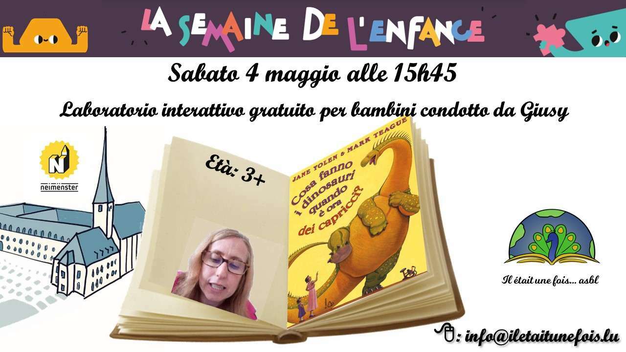 ![]() | FESTIVAL DE L’ENFANCE 2024 / Laboratorio interrativo per bambini (3+) condoto da Giusy04. Mai 2024 | de 15h45 à 16h30 Code d'activité : AT040524ITLaboratorio interrativo gratuito per bambini (3+) condoto da Giusy Lingua: italiano età: 3 anni + Località: Abbazia di Neumünster Prezzo: gratuito Durata: Da 30 a 40 minuti Libro: Cosa fanno i dinosauri quando è ora dei capricci? Auteur: Yolen, Jane - - - - - - - - - - - - - - - - - - - - - - - - - - - - - - - - - - - - - - - Registrazione : info@iletaitunefois.lu 1-2) Romeo et Valentino 3-4) Karim 9 et Yacoub 4 5) Francesco 10 6) Romeo 7) Riccardo 7 8) Andrea 5 |