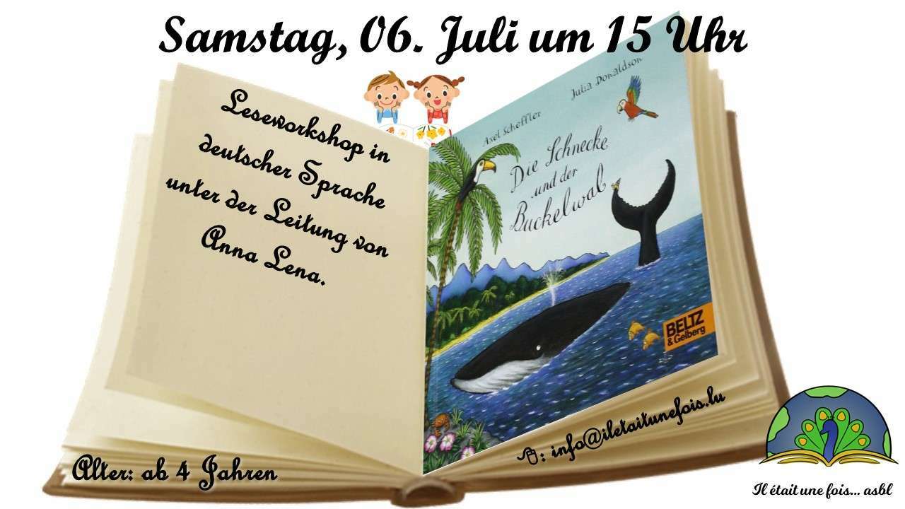 ![]() | Leseworkshop für Kinder in deutscher Sprache unter der Leitung von Anna Lena06. Juillet 2024 | de 15h à 16h Code d'activité : AT060724DELeseworkshop für Kinder in deutscher Sprache unter der Leitung von Anna Lena. Sprache: Deutsch Moderatorin: Anna Lena Alter: ab 4 Jahren Preis: Kostenlos Dauer: eine Stunde Die Schnecke und der Buckelwal vun Donaldson, Julia ;Scheffler, Axel (Beltz & Gelberg) Die abenteuerliche Reise der kleinen Schnecke und des Wals, der ihr die Wunder dieser Welt zeigt. Doch, wie man weiß, steckt die Welt auch voller Gefahren, und da ist es nur gut, wenn man einen Freund hat, der einen in höchster Not rettet - auch wenn der so klein ist wie eine Seeschnecke. Ein Klassiker zum Vorlesen von den Schöpfern des weltberühmten »Grüffelo«, mit Reimen von Julia Donaldson und mit unvergesslichen Bildern von Axel Scheffler. - - - - - - - - - - - - - - - - DIY: Die Schnecke - - - - - - - - - - - - - - - - Anmeldung: info@iletaitunefois.lu (mit dem Vornamen und Alter des Kindes sowie dem Aktivitätscode AT060724DE) Anwesenheit eines Erwachsenen mit dem Kind 1) Alice 9 2 3 4 5 6 7 8 Vielen Dank und bis bald. |