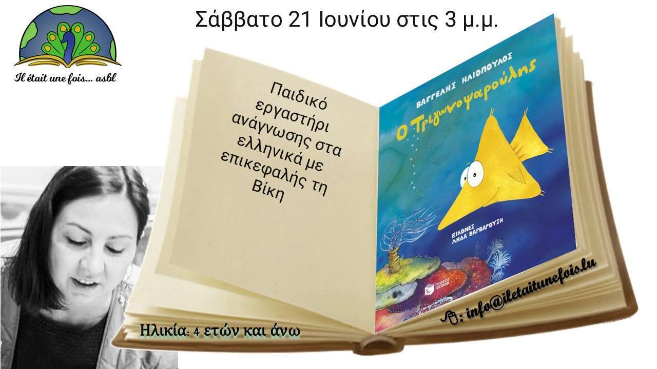 ![]() | Παιδικό εργαστήρι ανάγνωσης στα ελληνικά με επικεφαλής τη Βίκη21. Juin 2025 | from 3 p.m up to 4 p.m. Activity code. AT170625GRΠαιδικό εργαστήρι ανάγνωσης στα ελληνικά με επικεφαλής τη Βίκη Γλώσσα: Ελληνικά Ηλικία: 4 ετών και άνω Παρουσία ενός απαραίτητου ενήλικα με το παιδί Τιμή: Δωρεάν DIY: θα οριστεί Βιβλίο: Ο Τριγωνοψαρούλης - - - - - - - - - - - - - - - - - - - - - - - - - - - - - - - - - - - - - - - - Εγγραφή: info@iletaitunefois.lu (παρακαλείσθε να αναφέρετε AT240525GR κωδικό, το όνομα και την ηλικία του παιδιού) 1) Melina 3,5 1) 2) 3 4) 5) 6) 7) |