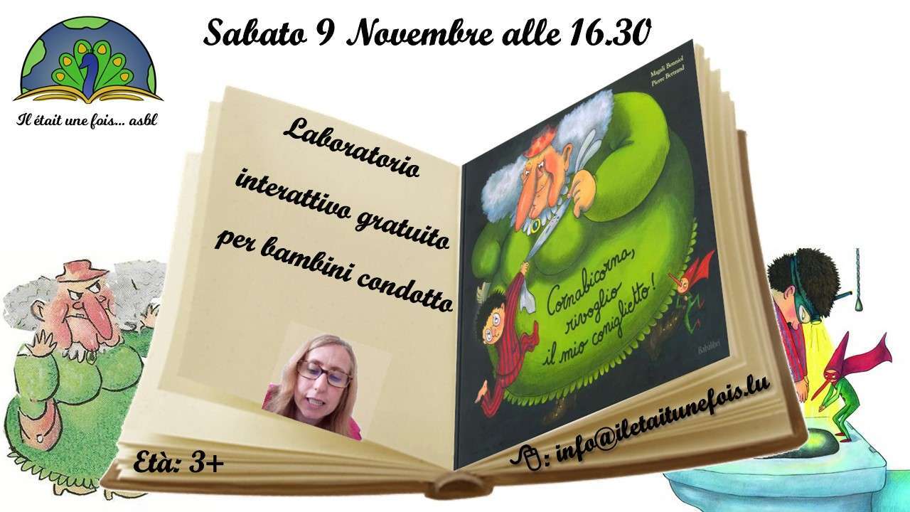 ![]() | Laboratorio interrativo gratuito per bambini (3+) animato da Giusy09. Novembre 2024 | De 16h30 à 17h30 - Code activité AT091124ITLaboratorio interrativo gratuito per bambini (3+) animato da Giusy Lingua: italiano Età di lettura: da 3 anni. Località: Il était une fois... asbl (Gasperich) Prezzo: gratuito Durata: un'ora Registrazione : info@iletaitunefois.lu (indicare il nome e l'età del bambino e il codice AT091124IT) Libro: "Cornabicorna rivoglio il mio coniglietto " di Magali Bonniol - - - - - - - - - - - - - - - - - E’ tornata Cornabicorna : Ci risiamo: Pietro non vuole mangiare la minestra e, questa volta, per una buona ragione. Ci ha sputato dentro la strega Cornabicorna! Dopo aver avuto il permesso di svuotare la zuppiera in bagno, se ne va tranquillo a dormire. Ma, nel mezzo della notte, una serie di rumori sinistri annunciano il ritorno di una furiosa Cornabicorna determinata ad infliggere a Pietro la peggior sofferenza della sua vita: gli ruberà il suo coniglietto! Riuscirà Pietro a recuperarlo? E quali stratagemmi dovrà inventare questa volta per sfuggire alle grinfie della strega? - - - - - - - - - - - - - - - - - - - - - - - - - Prenotazione consigliata (posti limitati) E' obbligatoria la presenza di un adulto o di un accompagnatore 1) Giulia 2) Vincenzo 3 3 Benedetta 4 Daniela 3 5 6 7 8 9 10 11 12 |