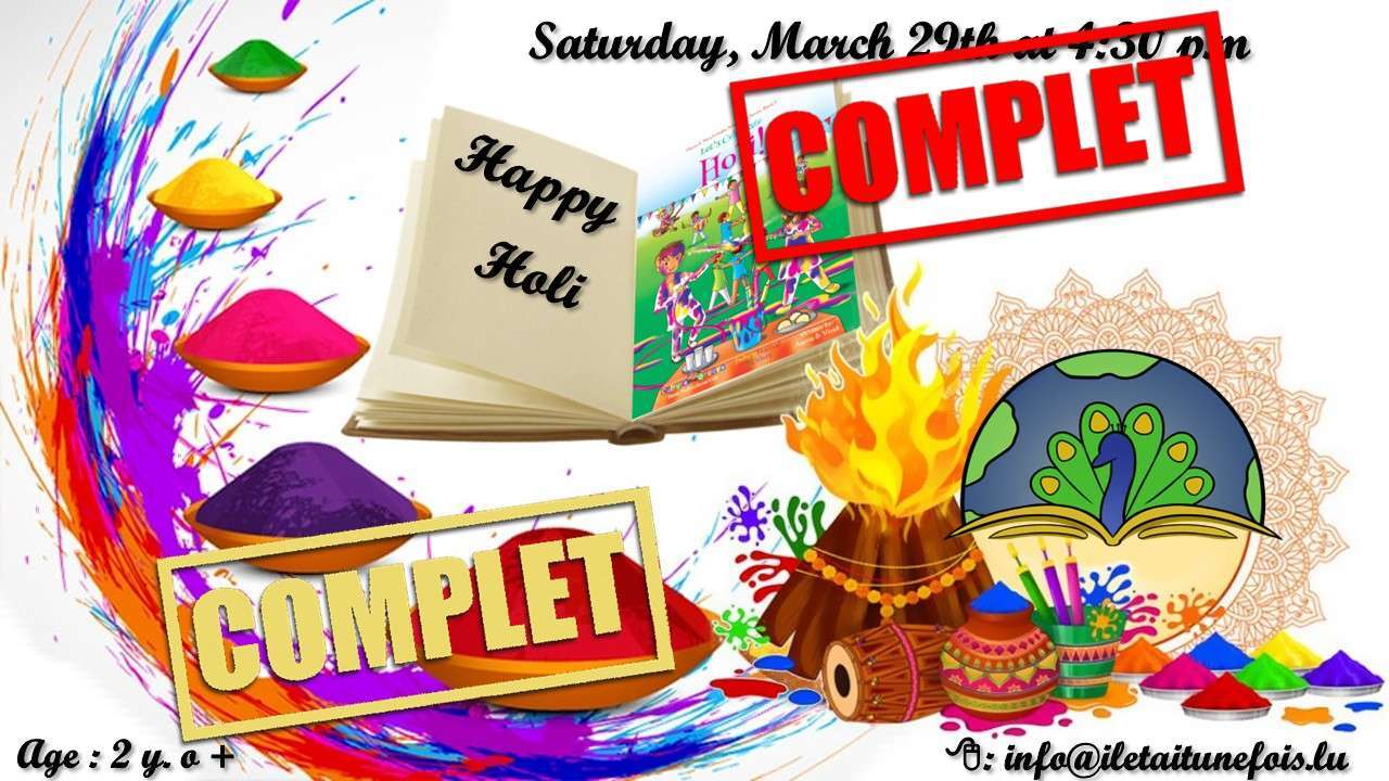 ![]() | COMPLET Let's celebrate Holy / Célébrons la fête des couleurs pour les enfants (2 ans et plus)29. Mars 2025 | de 16h30 à 17h30 - Code d'activité AT290325ENFRCOMPLET Meeting point: Il était une fois... asbl 6, rue Tony Bourg L-1278 Gasperich Let's celebrate Holi Happy Holi / Fête des couleurs en Inde Language : English / French Age: 2 yo + Duration: One hour Do not forget to wear white and old clothes Reservation (required) : info@iletaitunefois.lu - - - - - - - - - - - - - - - - - - - - Book : Let's celebrate Holi Once upon a time, an evil king ruled in India. He thought he was the most powerful king of the world. He wanted everyone to pray with him A brave little boy named Prahlad wasn't afraid though. Prahlad refused to pray to the evil king... - - - - - - - - - - - - - - - - - - - - Il était une fois un roi maléfique qui régnait en Inde. Il pensait qu'il était le plus puissant roi du royaume et c'est pour cela que tout le monde devait le respecter et l'honorer. Mais Prhalad, un petit garçon, n'était pas du tout de cet avis... - - - - - - - - - - - - - - - - - COMPLET 1 Adhvik 8 2-3 Adriano 5 and Viola 3 3 Alyssa 4 4 Ariana 3 5 Charlotte 3 6 Christopher 5 7 Dara 4 8 Dario 3 9 daughter Pawar 10-1 David et Rajveer 12 Edoardo 2 13 Elena 3 14 Élise 15 Emma 4 16 Evelyn 7 17 Gabriel 18 Giulia 6 19 Giuseppe 20-1 Gowtham 7 and Ashwin 4 22 Ini 3 23 Isabelle (2ans) 24-5 Kristina and Kalina 26 Lea 2 27 Luna 16 mois 28 Maddy 3 29 Martin 30 Matthieu 31 Maximos 8 32 Nishita Dewan 10 33 Reyansh 3 34 Riccardo 35 Roman 3 36 Romy 6 37 Sai kishan 4 38 Saya 2 39-40 Sofia 2 et Anna 3 41 Vincenzo 4 42-3 Violeta daughters 3 & 1,5 44 Virgile 3 45 Yuvin Vijay 4 |