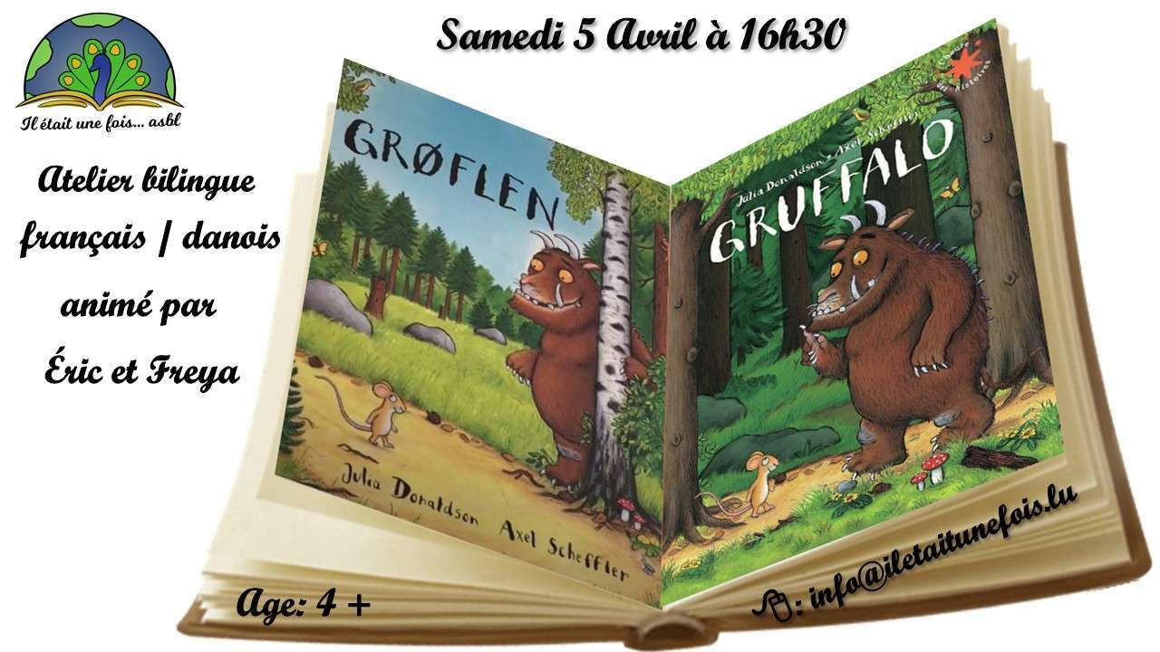 ![]() | ANNULÉ: Atelier français / danois interactif pour enfants (3+)05. April 2025 | DE 16H30 à 17H30 Code d'activité AT050425FRDKAtelier de lecture bilingue français / danois pour enfants (3+) Prix : gratuit Langue: français / danois Animateur: Freya / Éric Lieu: Il était une fois... asbl 6, rue Tony Bourg L-1278 Gasperich âge: 3 ans et plus Livre : Gruffalo / Grøflen Une petite souris se promène dans la grande forêt. Sur son chemin, elle croise le renard, le hibou et le serpent qui la trouvent bien appétissante et l'invitent à déjeuner chez eux. Mais la petite souris, très maligne, refuse leur invitation car elle a rendez-vous avec un... gruffalo ! C'est bien mystérieux, un gruffalo... Une histoire pleine d'humour qui amusera tous les enfants. DIY: Gruffalo - - - - - - - - Inscription par mail info@iletaitunefois (veuillez indiquer 'âge et le prénom de l'enfant et le code AT050425FRDK (places limitées) Merci et à bientôt ANNULE CAUSE MALADIE 1-2 Leonardo 3 et Sofia 1,5 3 Leonardo 4 4 5 6 7 8 |
