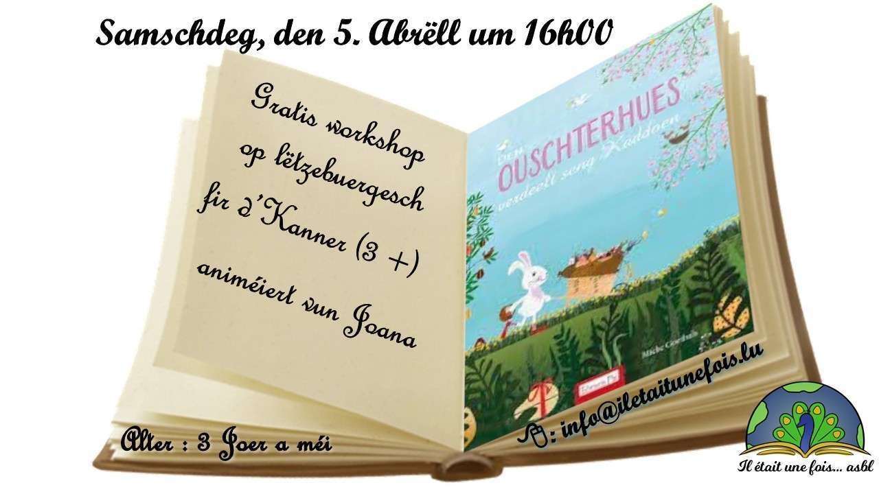 ![]() | Gratis Liesung fir d'Kanner (3 Joer+) op Lëtzebuergesch animéiert vun Joana05. April 2025 | de 16h à 17h. Code d'activité AT050425LUGratis Liesung fir d'Kanner (3 Joer+) op Lëtzebuergesch animéiert vun Joana Animateurin : Joana Alter: 3 Joer a méi Sprooche: Lëtzebuergesch Buch: Den Ouschterhues verdeelt seng Kaddoen DIY: à définir - - - - - - - - - - - - - - - - - - - - - - - - - - - - - - - - - Umeldung: info@iletaitunefois.lu / Tel. 621.356.429 Gitt wgl. bei der Umeldung den Alter vum Kand un. 1 Benedetta 2 3 4 5 6 7 8 9 10 |