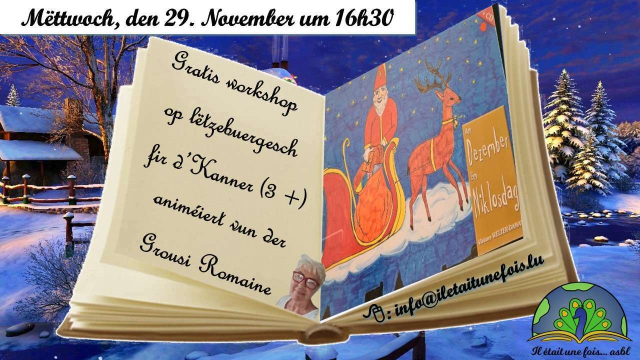 ![]() | Gratis Liesung fir d'Kanner (3 Joer+) op Lëtzebuergesch animéiert vun der Grousi Romaine29. November 2023 | de 16h30 à 17h30 Code activité: AT291123LUGratis Liesung fir d'Kanner (3 Joer+) op Lëtzebuergesch animéiert vun der Grousi Romaine Präis: Gratis Animateurin: Romaine Sprooch: Lëtzebuergesch “Am Dezember ëm Niklosdag” - Viviane Welter-Daman Eng Geschicht fir Kanner vun 2 bis 8 Joer. - - - - - - - - Umeldung: info@iletaitunefois.lu / Tel. 621.356.429 Gitt wgl. bei der Umeldung den Alter vum Kand un. 1-2) 2 enfants de 3 et 7 ans 3) Giulia 2,5 4) Daniela 3 5-6-7) Moritz 7, Amelie 4 et Louise 4 |