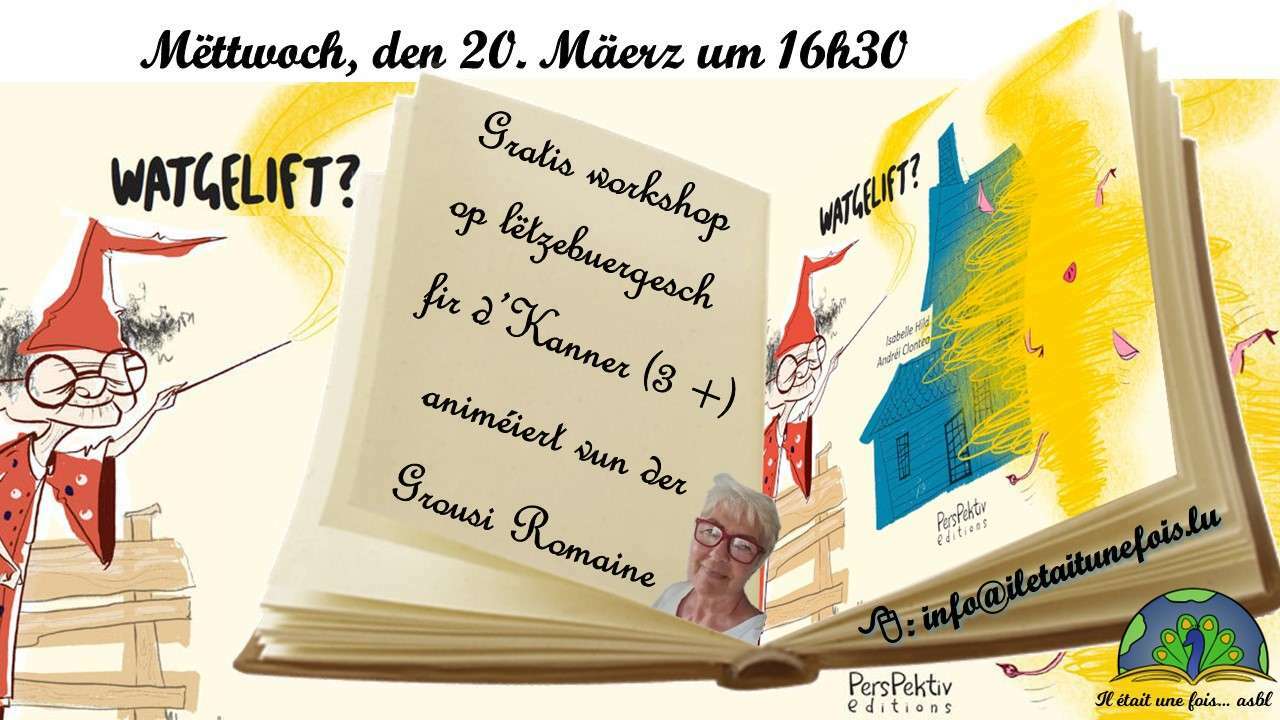![]() | Liesung fir d'Kanner (3+) op Lëtzebuergesch animéiert vun der Grousi Romaine20. Mars 2024 | de 16h30 à 17h30 Code d'activité : AT200324LUGratis Liesung fir d'Kanner (3 Joer+) op Lëtzebuergesch animéiert vun der Grousi Romaine Präis: Gratis Animateurin: Romaine Sprooch: Lëtzebuergesch Fir d'Kanner ab 3 Joer. Buch : "WATGELIFT" - Isabelle Hild , Andrea Clontea - Perspektiv Editions - - - - - - - - - - - - - - - - - - D’Kressida ass eng léif Fee, déi esou gär deenen aneren e Wonsch erfëllt. Leider héiert si net gutt a versteet net alles richteg. Dowéinst geet beim Zauberen esou munches schif ... - - - - - - - - - - - - - - - - - - - - - - - - - - - - - - - - - Umeldung: info@iletaitunefois.lu / Tel. 621.356.429 Gitt wgl. bei der Umeldung den Alter vum Kand un. 1) Jonathan 5 2) Lou 5 |