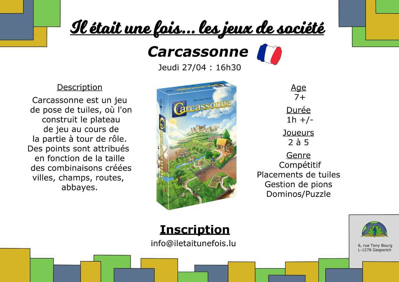 ![]() | Atelier gratuit de jeu de société pour enfants (7+)11. May 2023 | de 16h45 à 17h45 Code d'activité : PR110523FRAtelier gratuit de jeu de société pour enfants Âge : 7 ans et plus Animateur: Cédric Langues : français/luxembourgeois/anglais Langue véhiculaire : français Prix: gratuit Jeu: Carcassonne (Jeu de stratégie / jeu familial) Carcassonne est un jeu de pose de tuiles, où l'on construit le plateau de jeu au cours de la partie à tour de rôle. Les règles sont assez simples: Des points sont attribués en fonction de la taille des combinaisons créées (villes, champs, routes, abbayes). D’une durée comprise entre 30 minutes et 1h, Carcassonne s’appuie sur la mécanique des dominos. Replongez dans l’ambiance du Moyen-Âge du Sud de la France en partant à l’assaut de ses terres, chemins et villes. Développez la meilleure stratégie pour affirmer votre pouvoir. Déjouez les plans de vos adversaires et triomphez en contrôlant le plus de territoires. Un championnat du monde se joue chaque année depuis 2006. inscription: info@iletaitunefois.lu |
