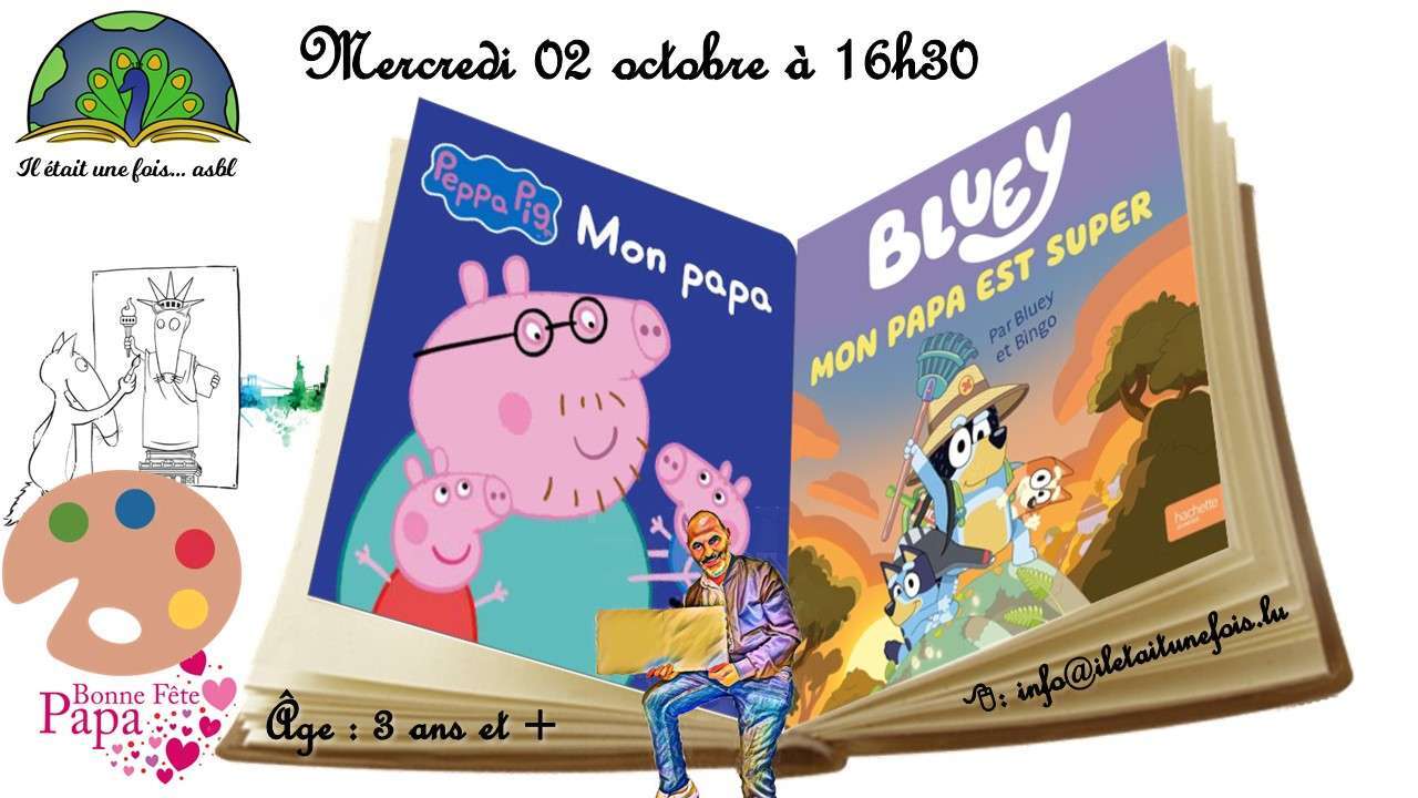 ![]() | Atelier de lectures interactives "Pappendag" pour enfants en français (3+)02. October 2024 | de 16h30 à 17h30 Code d'activité AT021024FRAtelier de lecture interactive pour enfants (Pappendag) Langue: français âge: 3 ans et plus Animation : Éric Lieu: Il était une fois... asbl 6, rue Tony Bourg. L-1278 Gasperich Présence d'un adulte indispensable avec l'enfant Prix: gratuit Durée: une heure Livres: Peppa Pig Mon Papa / Bluey: Mon papa est super - - - - - - - - - - - - - - - - - - - - - - Je m'appelle Peppa et ce livre parle de mon papa. Mon papa, c'est le plus drôle: il rit tout le temps! (surtout quand il joue avec mon petit frère George et moi) #famille #Pappendag #papa - - - - - - - - - - - - - - - - - - - - - - Bricolage: Peinture - - - - - - - - - - - - - - - - - - - - - - - Inscription : info@iletaitunefois.lu (merci d'indiquer le prénom et l'âge de l'enfant ainsi que le code d'activité AT021024FR) 1 2 3 4 5 6 7 8 |