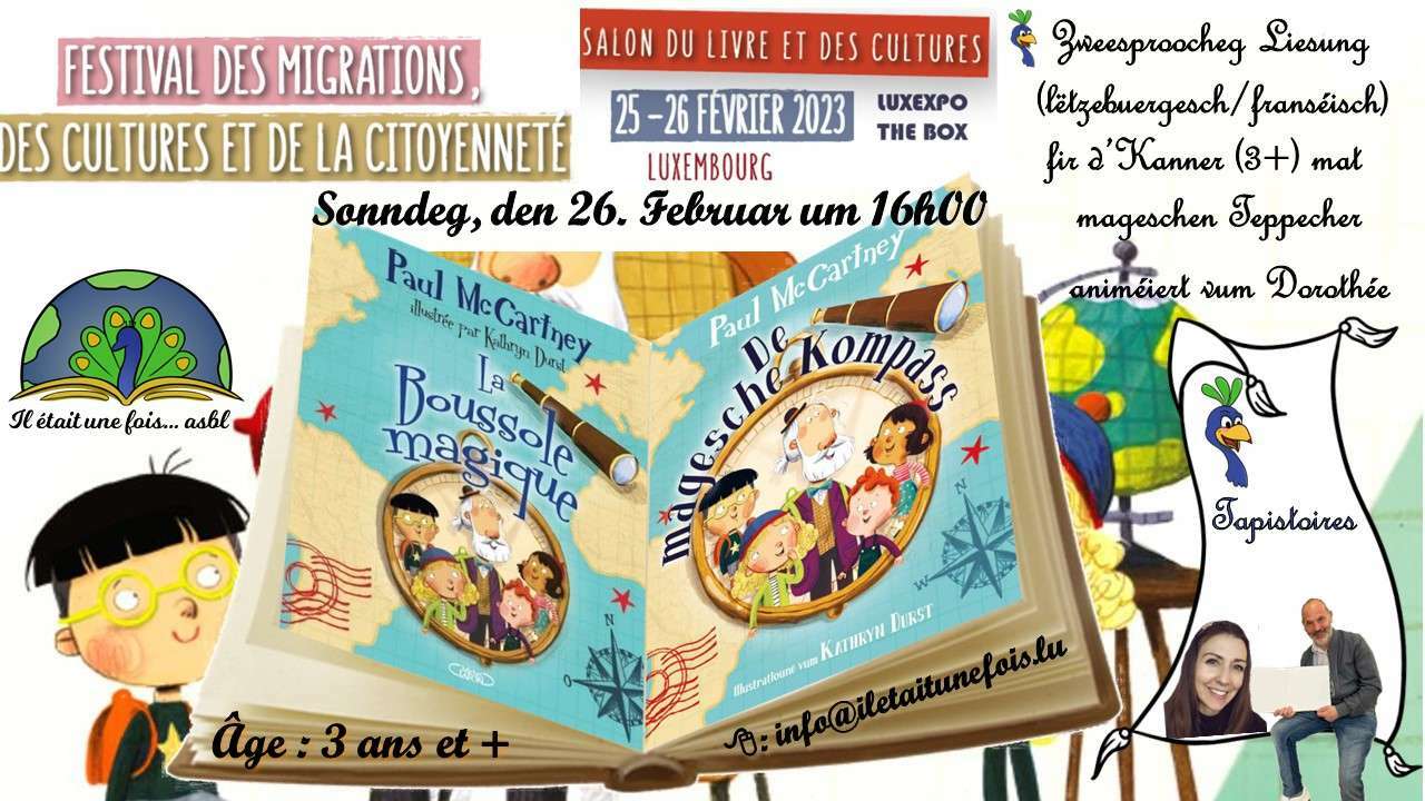 ![]() | Zweeproocheg Liesung (lëtzebuergesch a franséisch) fir d'Kanner (3+)26. February 2023 | de 16h00 à 17h00 Code d'activité : AT260223LUFRZweeproocheg Liesung (lëtzebuergesch a franséisch) fir d'Kanner Heure: de 16h30 à 17h30. Âge : Enfants (accompagnés) à partir de 3 ans Animatrices : Dorothée / Éric Prix : gratuit Langues : Français et Luxembourgeois Durée: Une heure Inscription (obligatoire): info@iletaitunefois.lu (merci de préciser le prénom de l'enfant) Remarque: un adulte doit accompagner l'enfant durant toute la durée de l'atelier - - - - - - - - - - - - - - - - - - - - - - - - - - Livre : La boussole magique / De Magesche Kompass - Paul McCartney - Perspektiv Éditions - - - - - - - - - - - - - - - - - - - - - - - - - - De Pätter huet ëmmer en Trick op Lager ... Wat huet dës Kéier wëlles ? Well seng Enkelkanner sech langweilen, kroopt de Pätter säi magesche Kompass eraus. Zesummen erliewen si e puer rasant Abenteuer uechter d’ganz Welt. „Ech wollt e Buch schreiwen, fir datt d’Grousselteren iwwerall op der Welt eng Geschicht hunn, fir hiren Enkelkanner virzeliesen.“ (Paul McCartney) - - - - - - - - - - - - - - - - - - - - - - - - - Utilisation de nos tapistoires (tapis magiques) Bricolage : Longue-vue / boussole magique - - - - - - - - - - - - - - - - - - - - - - - - - |