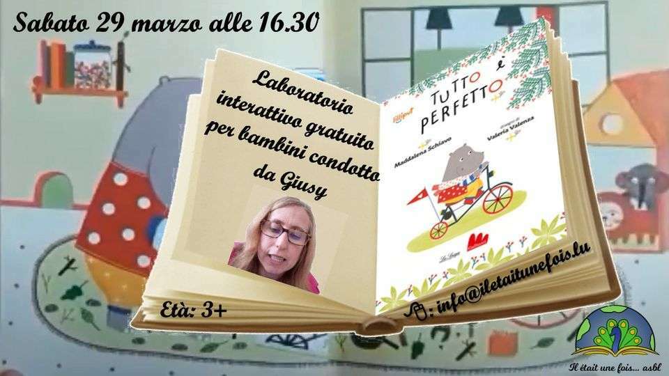![]() | Laboratorio interrativo gratuito per bambini (3+) condoto da Giusy29. April 2023 | de 16h30 à 17h30 Code d'activité : AT290423ITLaboratorio interrativo gratuito per bambini (3+) condoto da Giusy Lingua: italiano età: 3 anni + Prezzo: gratuito Durata: un'ora Registrazione : info@iletaitunefois.lu Libro: "Tutto è perfetto" de Maddalena Schiavo - - - - - - - - - - - - - - - - - - - - - - - - - - - - - - - - - Ecco a voi le avventure di un ippopotamo innamorato della sua nuova bicicletta. La ammira per giorni e giorni finché non decide di uscire di casa alla ricerca di altre cose belle, rotonde e perfette come le sue ruote… - - - - - - - - - - - - - - - - - - - - - - - - - - - - - - - - - Fai da te: disegno personalizzato di perfezione - - - - - - - - - - - - - - - - - - - - - - - - - - - - - - - - - |
