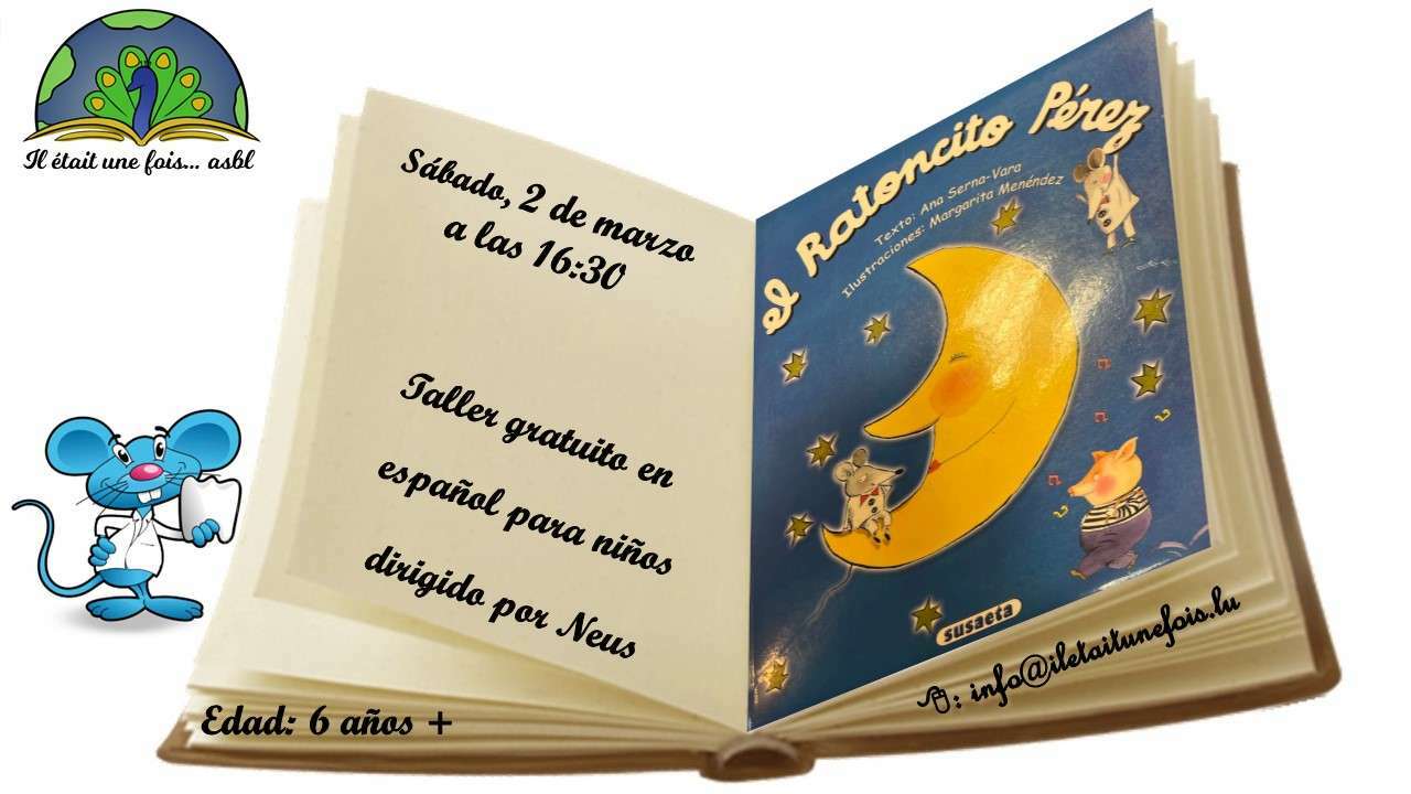 ![]() | *** COMPLETO*** Taller en español para niños (3+) dirigido por Neus02. Mars 2024 | de 16h30 à 17h30 Code activité AT020324ES*** COMPLETO*** Taller gratuito en español para niños dirigido por Neus (3 años +) Libro : "El ratoncito Pérez" de Anna Serna-Vara --------------------------------------------------------------------------------- El ratoncito Pérez, ese personaje tan querido por los niños, recoge cada noche los dientes de leche caídos y los cambia por regalos. Pero ¿sabes por qué el ratoncito Pérez empezó esta extraña costumbre? Este cuento, ideal para los primeros lectores por las alegres ilustraciones y la redacción sencilla con letra grande, nos descubrirá todos los detalles de esta original historia. --------------------------------------------------------------------------------- Registration: info@iletaitunefois.lu Sírvase indicar la edad y el nombre del niño. Presencia obligatoria de un adulto con el niño. 1) Claudia 3,5 2) Alberto 3 3) Carla 4 4-5) Valentin 5 Rafael 3 6-7) Mia 5 Alan 3 8) Daniel 3 ***COMPLETO*** |