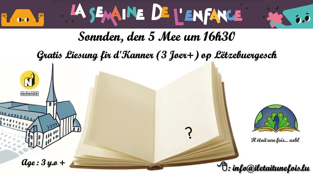 ![]() | FESTIVAL DE L’ENFANCE 2024 / Liesung fir d'Kanner (3 Joer+) op Lëtzebuergesch05. Mai 2024 | de 16h30 à 17h00 Code d'activité : AT050524LUGratis Liesung fir d'Kanner (3 Joer+) op Lëtzebuergesch Präis: Gratis Ort: Neimënster Abbey Sprooch: Lëtzebuergesch Beschreiwung: Zesumme (d'Kanner an hir Elteren) lauschtere mir Umeldung: info@iletaitunefois.lu / Tel. 621.356.429 Gitt wgl. bei der Umeldung den Alter vum Kand un. - - - - - - - - - - - - - - - - - - - - - - - - - 1-2) Jan et Adrian - 5 et 2 3-4) Inaya 6 & Meliya 3 |